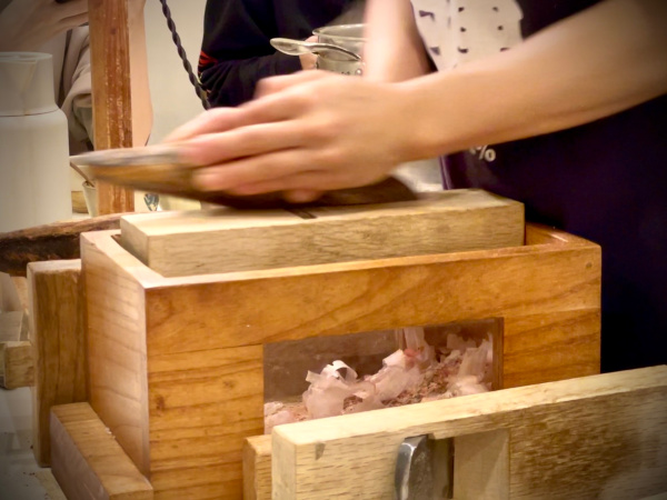 At the counter, Ms. Nagamatsu shaves katsuobushi freshly for every order for each customer.