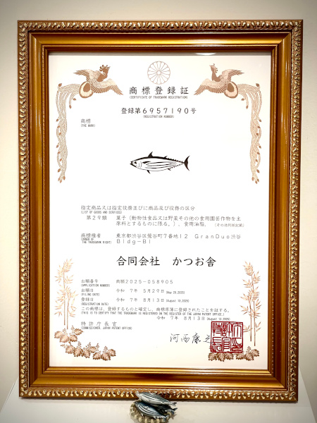 I was delighted to see the registration certificate for the trademark (Japanese Trademark Registration No. 6957190) displayed inside the restaurant, which we had assisted in applying for and registering. The bonito illustration for this trademark was created by Ms. Nagamatsu’s grandmother, who inspired her to start this business and the restaurant. I recalled her words when she requested the application: “This illustration symbolizes the restaurant’s identity, so I definitely want to trademark it.” This illustration, imbued with Ms. Nagamatsu’s passion, will continue to support the restaurant as its signboard and symbol.