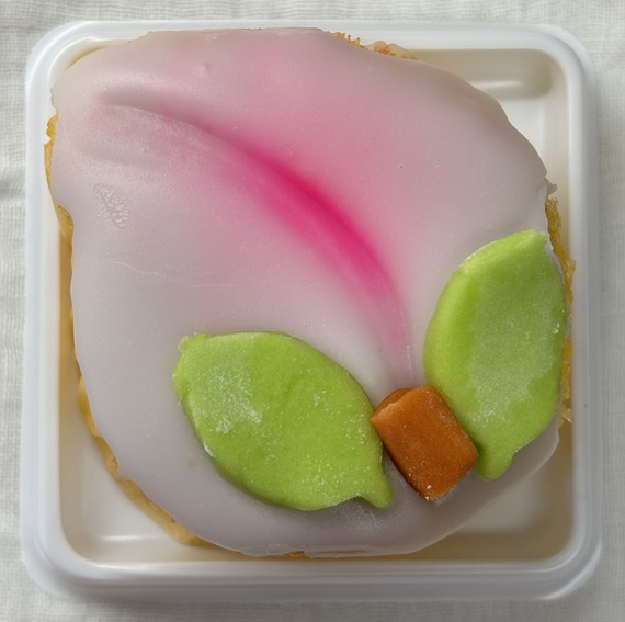 It’s a very cute treat featuring a fluffy castella sponge cake and sugar decorations shaped like a peach.